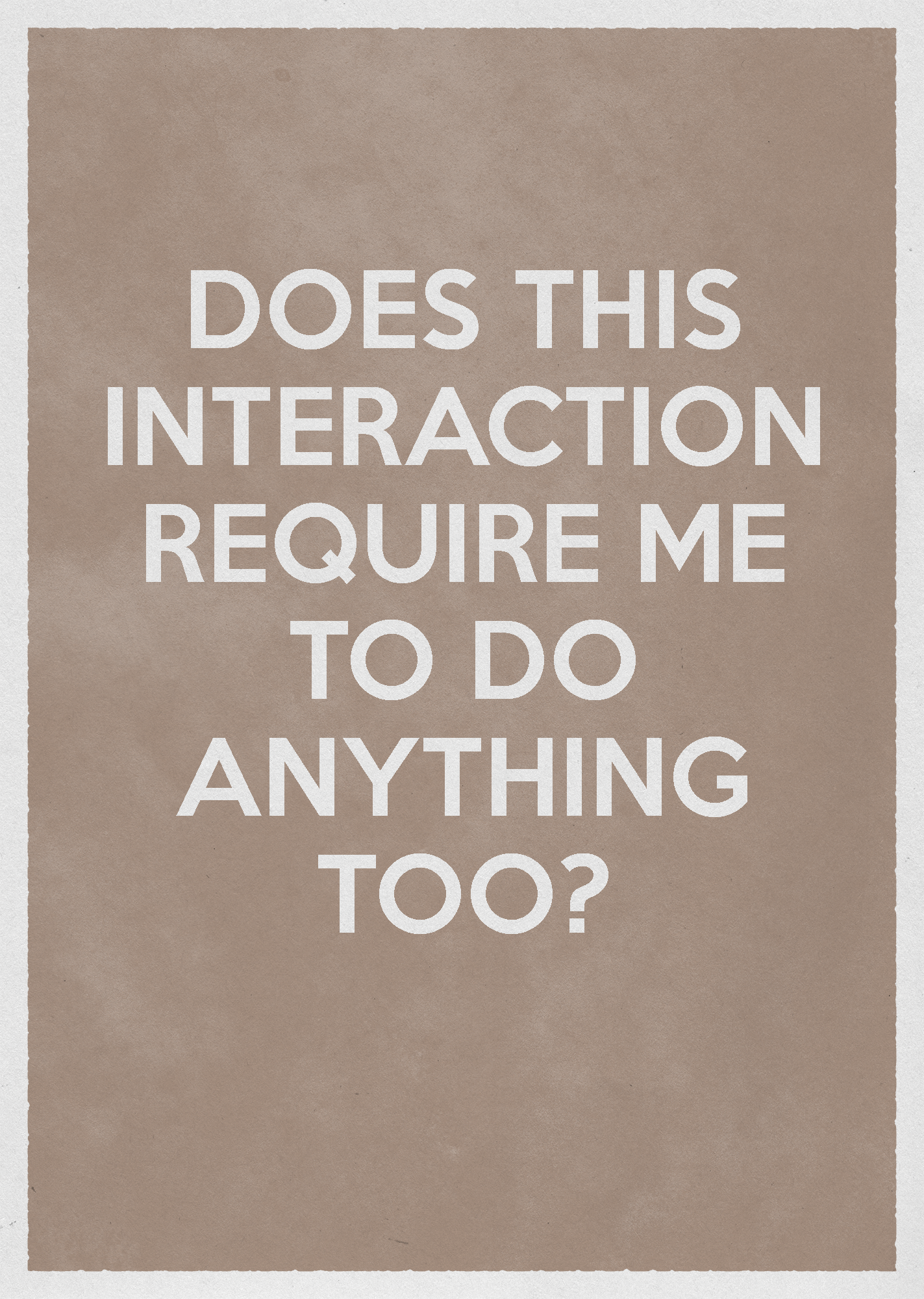 A selection of digital prints created from notes made throughout a lecture on the implications and consequences of interactivity in art. The prints were conceived as discussion points in response to various critiques of new media art and its use of mainstream conventions and platforms to subvert the traditional framing device of the passive, inactive art forms within gallery spaces.
